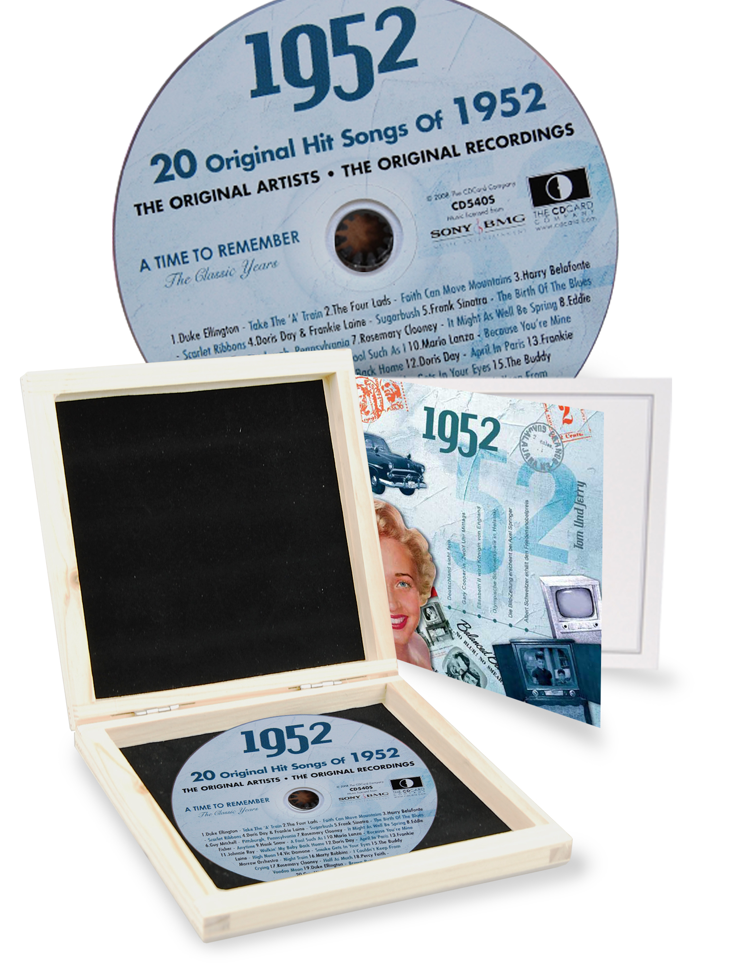 Ein musikalisches Highlight aus dem Jahr 1952. Die Original Sony Hits in englischer Sprache. Die Musik CD des Jahrgangs 1952 in besonders hochwertiger und luxuriöser Holzschatulle aus Birnbaumholz. Zusätzlich erhalten sie eine passende Geburtstagskarte inklusive Kuvert, um ihre ganz persönliche Nachricht an den Beschenkten hinterlassen zu können. Der besondere Geschenk-Tipp für den Jahrgang 1952.