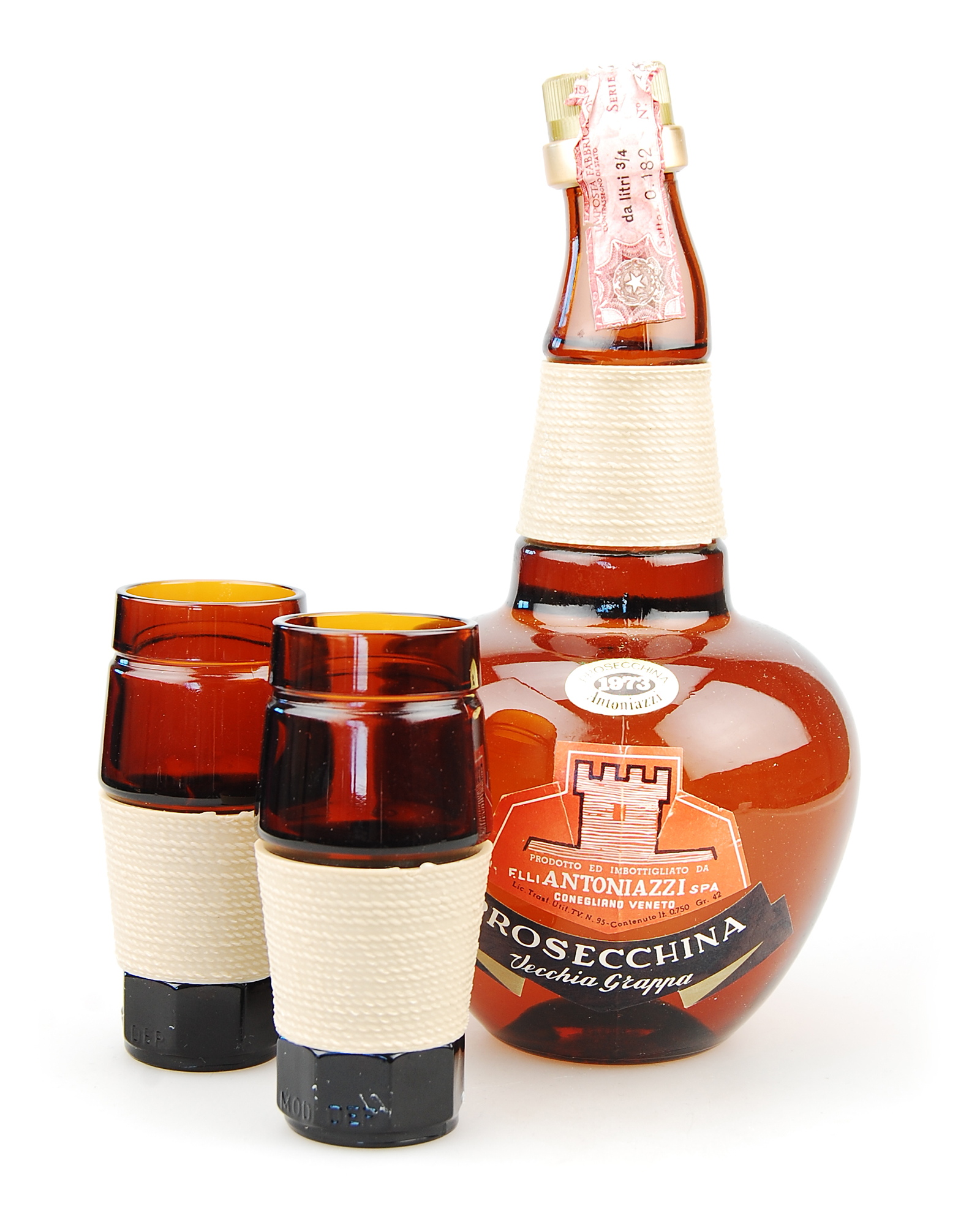 Eine außergewöhnliche und besonders seltene Top-Rarität: Jahrgangsgrappa 1973 Antoniazzi Vecchia Prosecchina per La Cantina Modena. Eine sensationalle Grappa-Rarität, eine auf insgesamt nur wenige Flaschen limitierte Serie dieses einzigartigen Jahrgangs 1973. Inklusive 2 Original-Gläser des Herstellers Antoniazzi.